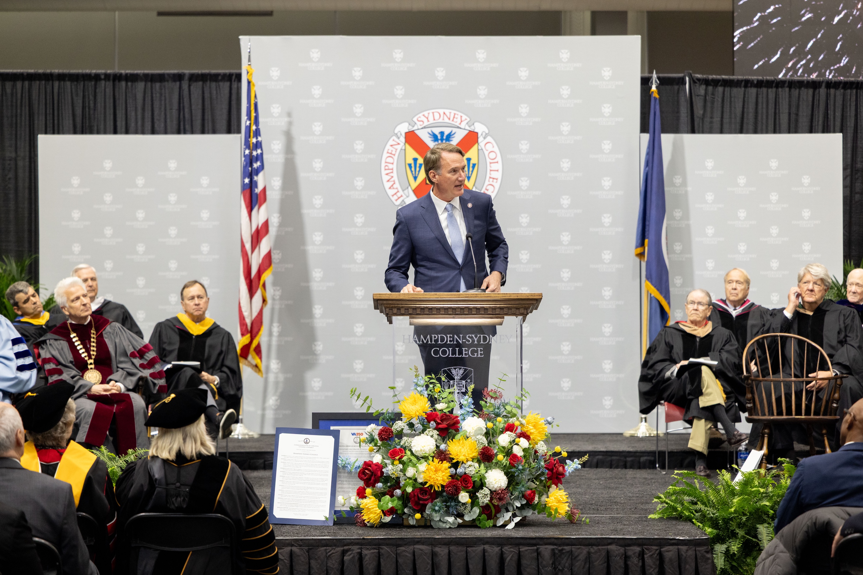 In addition to the governor and college president, speakers included Peebles Harrison, H-SC class of 1989 and chairman of the college's board of trustees; H-SC Spalding Professor of Chemistry and Faculty Marshal Herb Sipe who has taught at the college for over 57 years; H-SC Dean of Culture and Community Desiree Nicholson; Student Body President Owen Williams; and former state delegate and current president of the Council of Independent Colleges in Virginia (CICV) Christopher Peace, H-SC class of 1998.