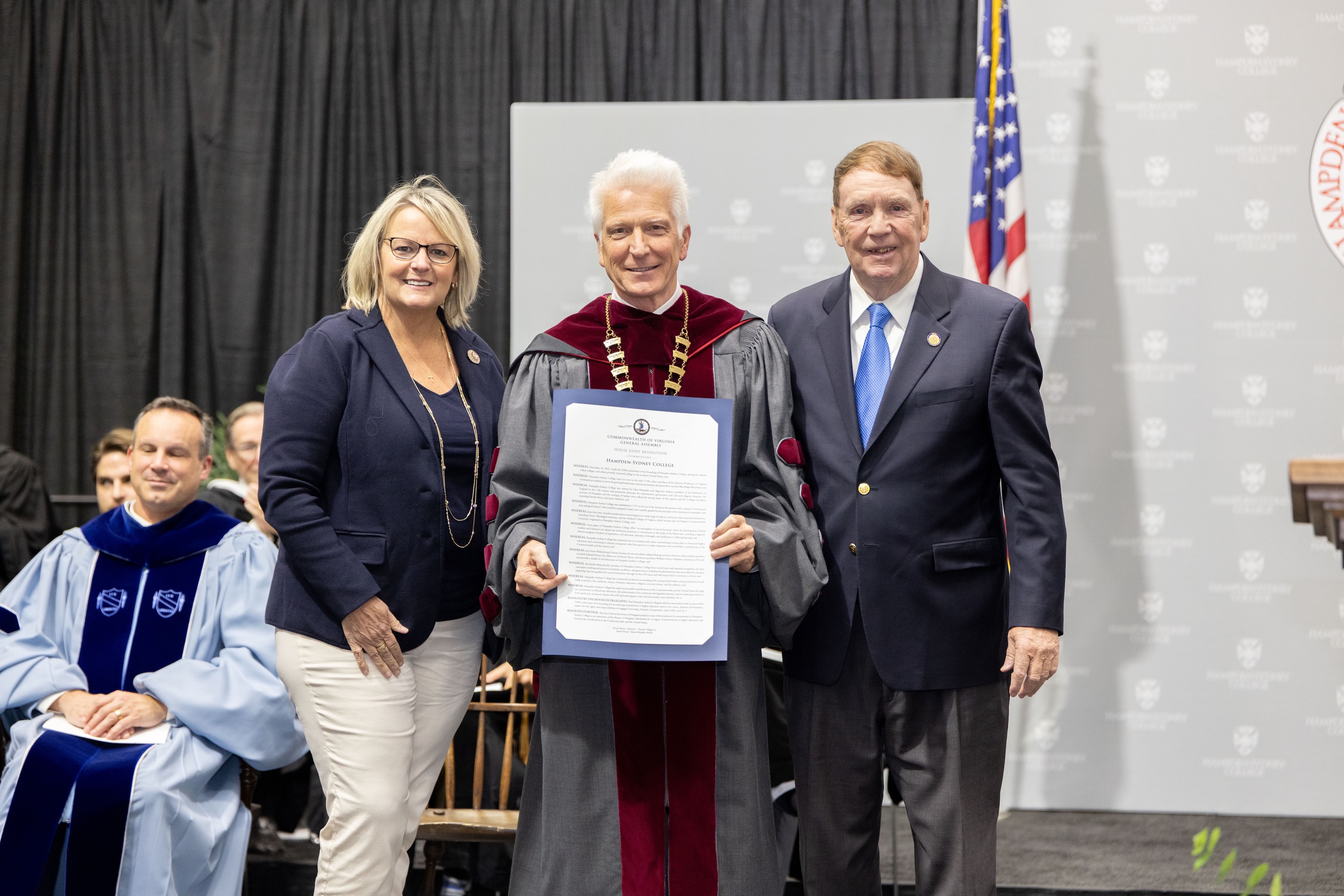 Also in attendance were Virginia Delegate Thomas C. Write Jr. and Virginia Senator Tammy Brankley Mulchi, who are co-sponsoring a House Joint Resolution commending Hampden-Sydney College on the 250th anniversary of its founding. A copy of the commendation was presented to President Stimpert.