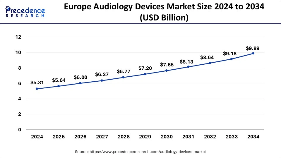 According to Precedence Research, the Europe audiology devices market size is valued at USD 5.64 billion in 2025 and is expected to exceed USD 9.89 billion by 2034, with a CAGR of 6.42%.