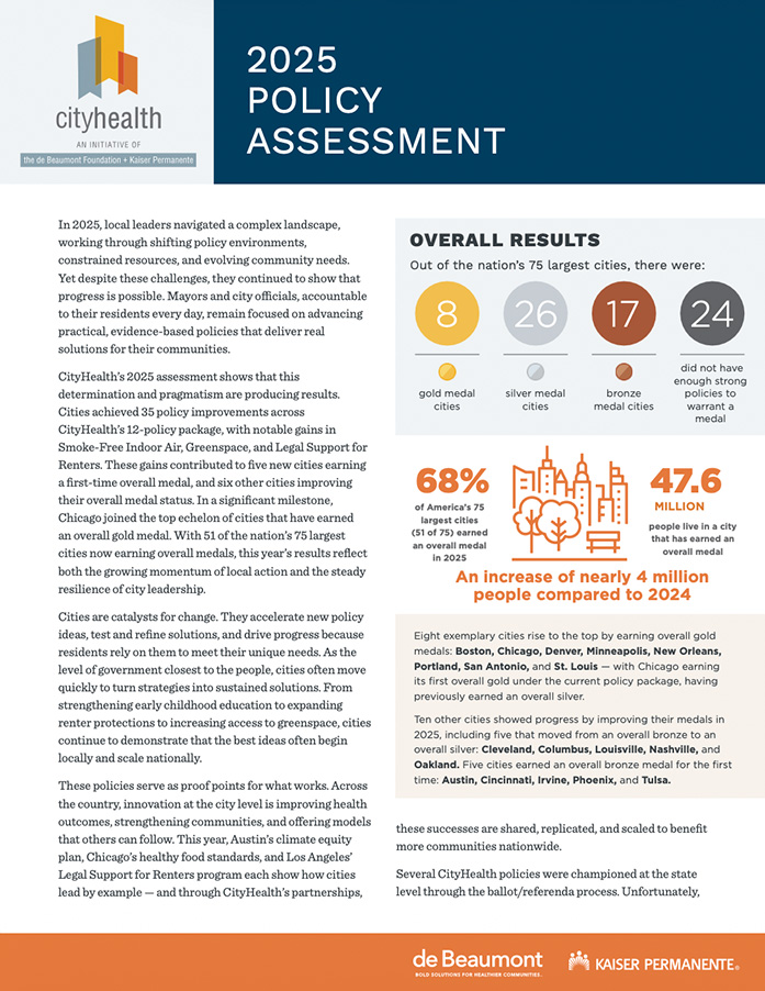 CityHealth, in partnership with the Center for Public Health Law Research at Temple University's Beasley School of Law and other evaluation partners, rated America's 75 largest cities based on the criteria established for each of the 12 policy solutions (listed below) using gold, silver, and bronze medals. For complete results, including individual medals by policy area, go to https://www.cityhealth.org/2025-assessment/.