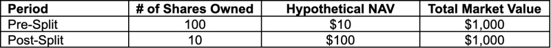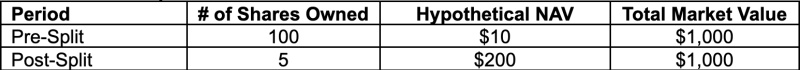 The next day's opening market value of the Funds' issued and outstanding shares, and thus a shareholder's investment value, will not be affected by the reverse split. The table below illustrates the effect of a hypothetical one-for-twenty or one-for-ten reverse split anticipated for the Funds: