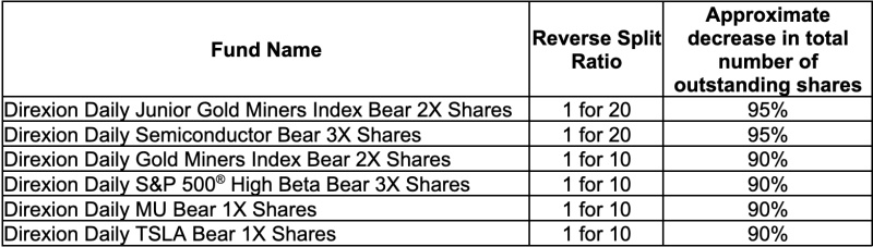 Direxion, a leading provider of ETFs for tactical traders, has announced it will execute a reverse split of the issued and outstanding shares of the Direxion Daily Junior Gold Miners Index Bear 2X Shares, Direxion Daily Semiconductor Bear 3X Shares, Direxion Daily Gold Miners Index Bear 2X Shares, Daily S&P 500 High Beta Bear 3X Shares, Direxion Daily MU Bear 1X Shares and Direxion Daily TSLA Bear 1X Shares, (the “Funds”). The total market value of the shares outstanding will not be affected as a result of this split, except with respect to the redemption of fractional shares, as outlined below.