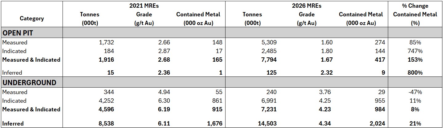 3. 2026 MREs are estimated using a cut-off grade of 0.3 g/t Au for open pit and a 2.0 g/t Au cut-off used to define underground stopes that constrain the blocks being reported.