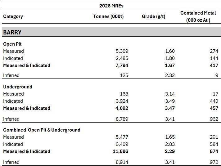 • Barry MREs (Underground): 0.457 Moz of Measured & Indicated Mineral Resources grading 3.47 g/t Au within 4.092 Mt, and 0.962 Moz of Inferred Mineral Resources grading 3.41 g/t Au within 8.789 Mt.