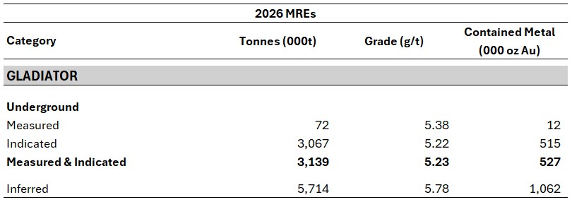 Table 3: Gladiator Deposit 2026 MRE