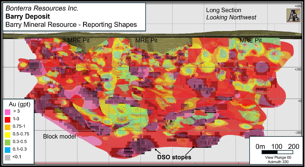 Mineralized domains were initially developed by Bonterra and were reviewed, modified and accepted by P&E. All Mineral Resources domains were defined within Leapfrog GeoTM software and sub-block model estimates were completed within Leapfrog EdgeTM. Underground constraining shapes at Barry and Gladiator were optimized using DeswikTM stope optimizer software. The limit of the Barry open pit Mineral Resources shell was optimized using NPV SchedulerTM software and was determined with consideration to underground mining costs. In addition to standard database validation techniques, wireframe and block model validation procedures, including wireframe to block volume confirmation, statistical comparisons with composite and nearest neighbour estimates, swath plots, visual reviews in 3D, longitudinal, cross-section, and plan views, and cross software reporting confirmation, were completed for all deposits.